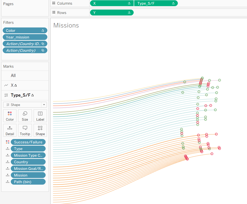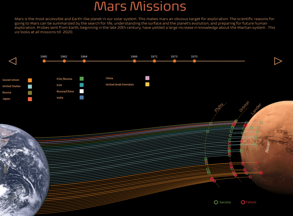 I really love reading about Space. Hence I created this viz out of personal interest. There are few interesting visualizations out there which has the same info. I wanted the viz to be interactive and also kind of show each mission as a line from Earth to Mars.It also had to specify Type of Mission, Success/Failure and some details on each mission.